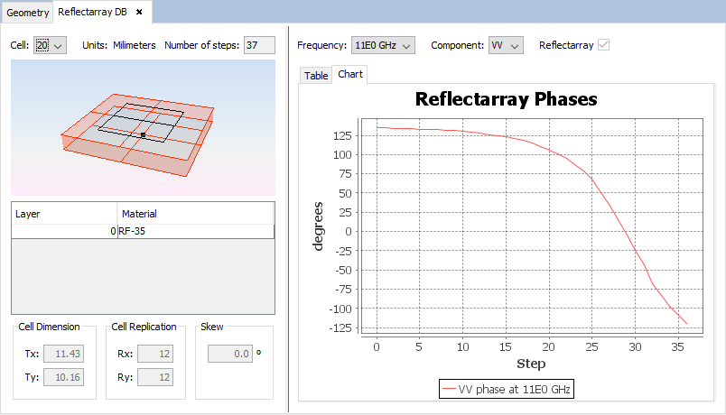 This case explains how to analyze a reflectarray layout. The database used on step 4 to create the reflectarray layout is the database for 37 steps and 20 divisions per wavelength (see Annex 2: Analysis of a Reflectarray Database Creation).