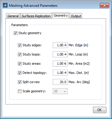 - Scale Geometry. To scale internally the geometry during the meshing process. When the mesh generation finishes, the output mesh has the same sizes as the original geometry. This option is useful for meshing very small structures. This option is only enabled when the Study Geometry button is activated.