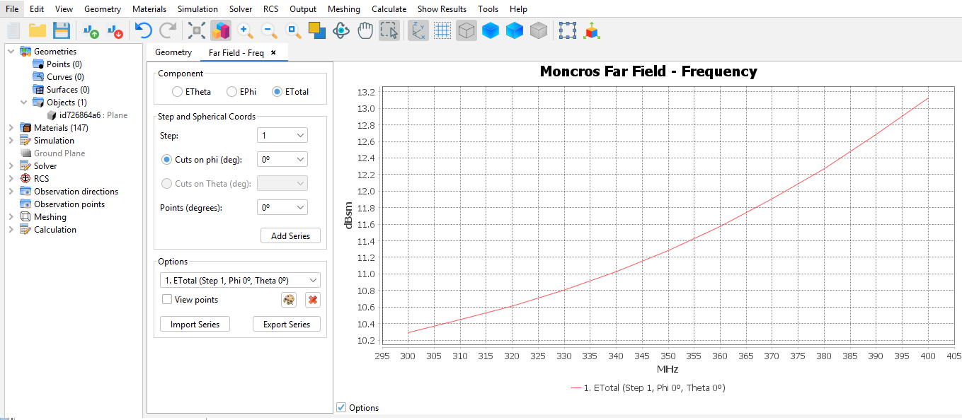 When initially open, the panel will display a default series in the plot that will represent the measurements for a particular component, step, and observation point in a phi or theta cut, against every possible frequency that has been simulated. More series can be added, by selecting component, step and spherical coordinates in the control panel that appears leftside to the plot.