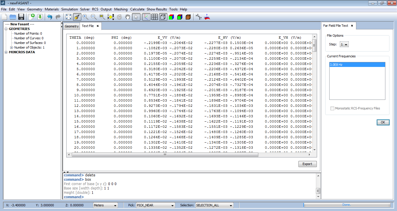This option lets the user inspect the results of the Far Field RCS values in a tabular like structure. Selecting this option will display a panel where the user should select a step and a frequency. To use this section, select a parametric step from the list, and select the frequency to get the results from and press OK to load the data. A table will be presented with the values for this frequency and step. To save the results press the Export button below the table.
