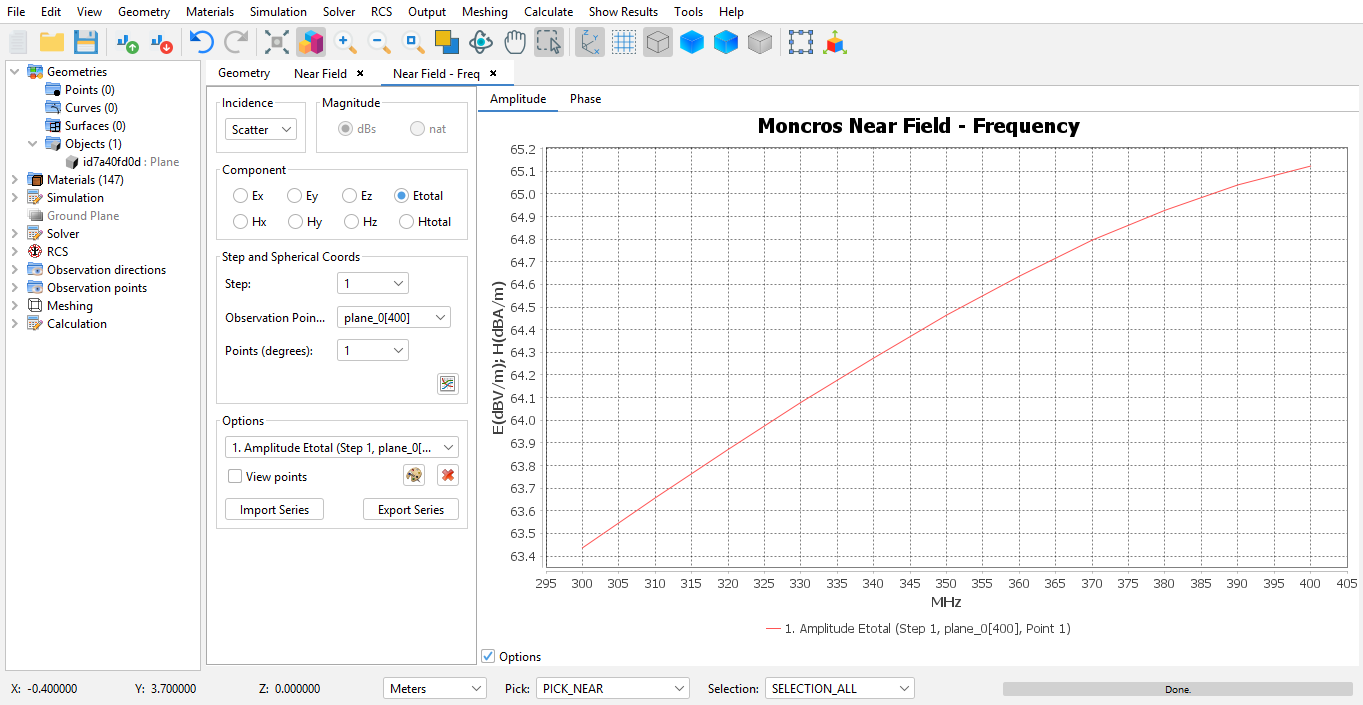 This option lets the user analyze the values for the near field through a frequency sweep. To make this section useful, a frequency sweep must have been previously calculated. The user can use this result view to generate plots that compare the values at near field for a particular Observation point in a given component and incidence and step through every frequency.