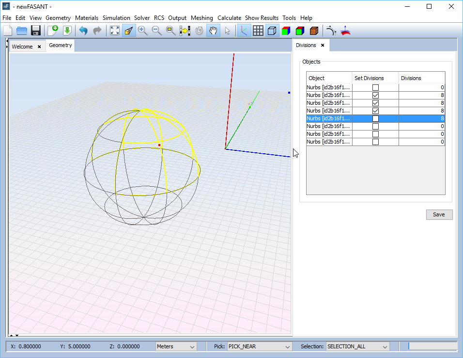 In order to use this setting, open this menu item. The Divisions tab will appear on the screen listing in the table every object and surface defined in this project. To override the global divisions value for a particular object or surface, enable the check box that appears in the same row, and change the divisions value near the check box. Press Save when all the desired settings have been changed in order to save the settings in the project.