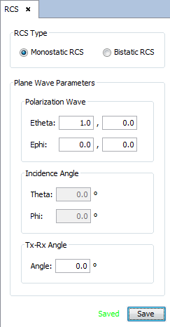 Select the RCS → Parameters option. Select Monostatic RCS and leave the default parameters. Press the Save button.