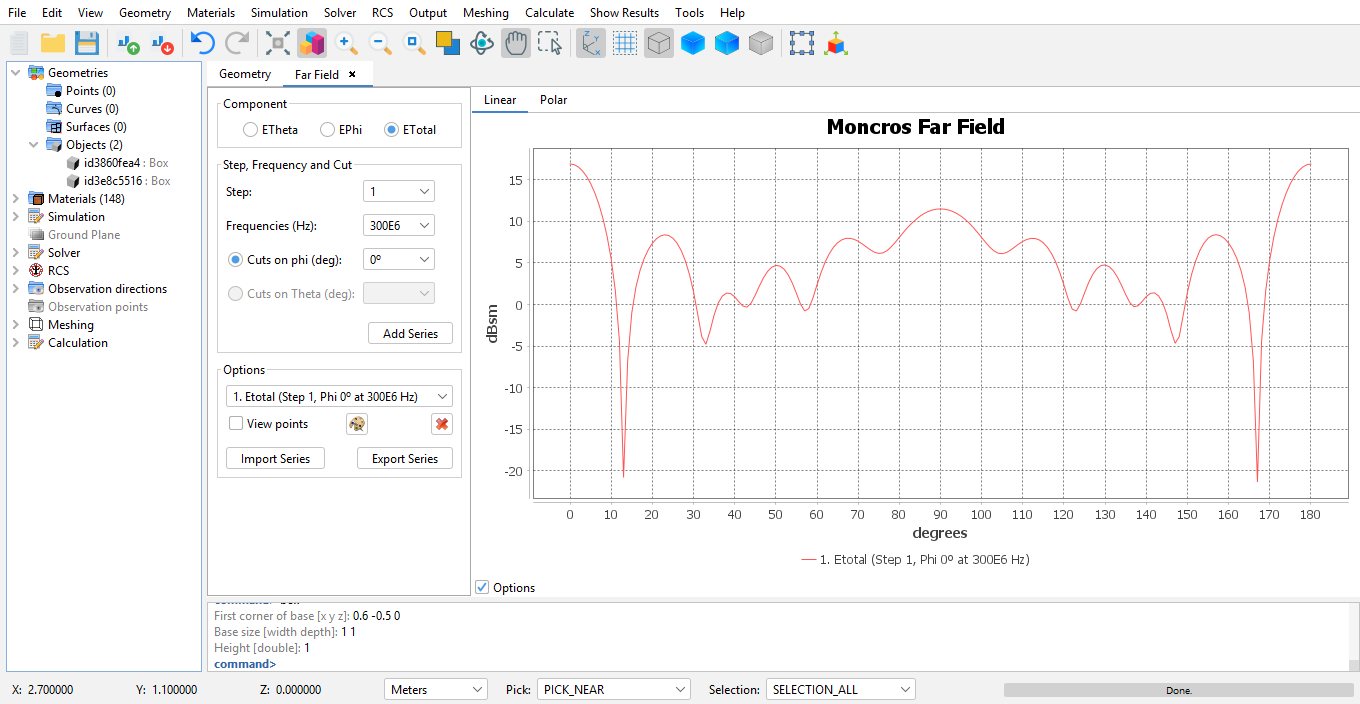 Select Output → Observation directions. Leave the default observation directions (0.0 phi cut with theta angle varying between 0.0 and 180.0 using 181 samples).