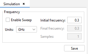 In the Simulation panel select a frequency of 0.3 GHz (default options) and press Save.