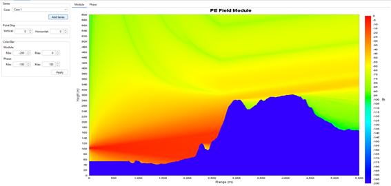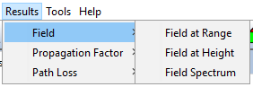 For each possible result type (field, propagation factor and path loss), there are three possible visualization options show the results at a given height for every possible value of range, show the results at a given range for every value of height, or show a color map of the value of the results of all the profile. The options under each submenu of the "Results" menu allow to choose between the three possibilities: