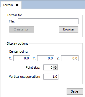 - Point skip: In some cases, terrain models will have too many points. This may cause the graphical user interface to lag due to the excessive computational resources needed to render the terrain model. This field indicates how many columns/rows of the terrain model are skipped between two successively rendered columns/rows. For instance, a value of 0 indicates that all points will be rendered, while a value of 2 indicates that the GUI will render one column/row of points, ignore the following two columns/row, render the next one and so on.