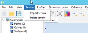 - Import terrain: Allows the user to import a terrain model into the project. Terrain models can be used for extracting the topographic profiles that will be used in simulation cases. The user can import terrain models with the GeoTiff or ARC/INFO ASCII GRID formats.
