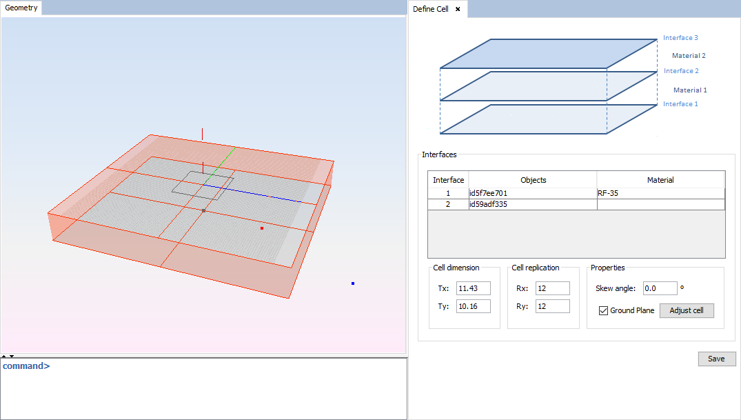 1. In the table, each row means an interface with it object. The material column refers to the material of the layer above the interface, i.e. the layer between the interface indicate by the row and the next interface. This interfaces are ordered from the lowest Z order to the upper (that can´t has a material). For the material on interface 1 select ‘RF-35’ on the list (the material added on the previous step).