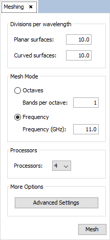 In this step a meshing with 10 and 20 divisions per wavelength will be compared for the cases with 7 and 37 steps. First, the models will be meshed with 10 divisions per wavelength to the simulation frequency. The number of processors to be selected, to improve the efficiency on time, will be the number of the processors of the machine where the example will be executed.