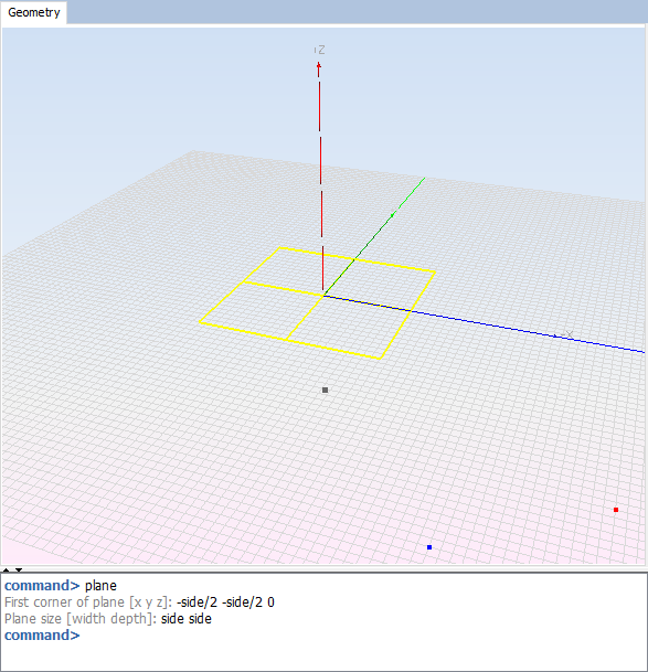 Generate a plane typing 'plane' on the command line panel, and introducing the parameters as the next figure shows. To see information about the use of the command line panel, see Command Line.