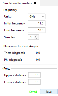 Set the initial frequency to 11 GHz, the final frequency with default values and the frequency samples set to 1. This options allows to configure a frequency sweep to analyze the cases for different frequencies. For this case only 11 GHz will be analyzed.
