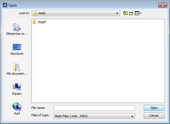 It is possible to visualize an existing mesh already generated by searching for mesh files (msh file extension), as shown in the following Figure. This option is only useful to visualize meshes, but not for simulations, unless the visualized mesh matches the one used in the current simulation project.