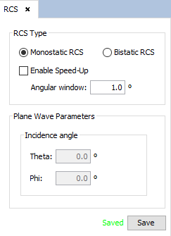- Bistatic RCS in this case, the user must define the angle of incidence (by default theta and phi are 0.0º).