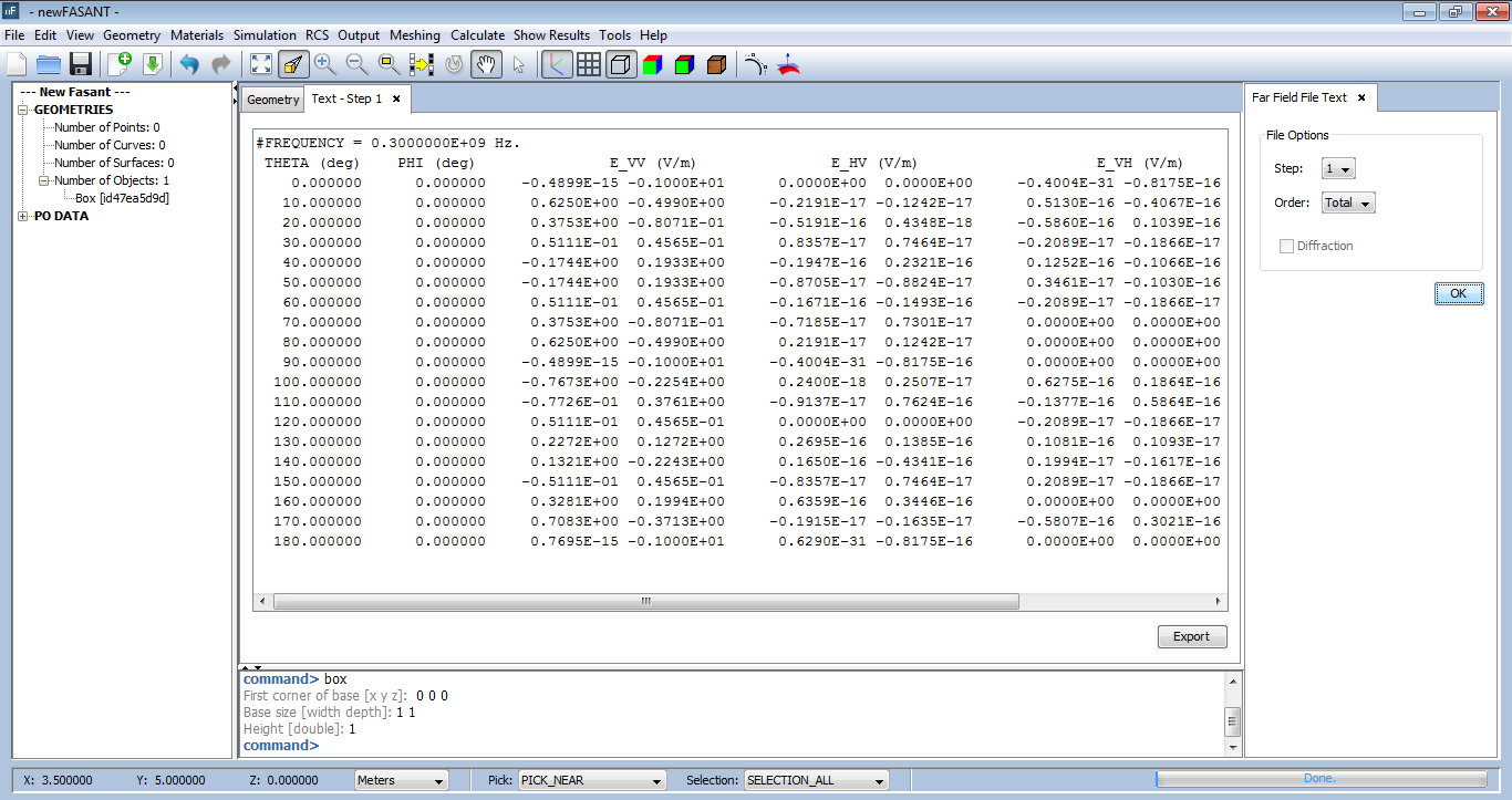 This option shows the simulation results as a text file. First,a panel should appear after selecting this option. Selecting this option will display a panel where the user should select a step and a frequency. To use this section, select a parametric step from the list, and select the frequency to get the results from and click on OK to load the data. A table will be prsented with the values for this frequency and step (see the next figure). To save the result click on the Export button below the table.