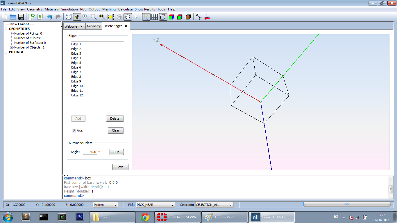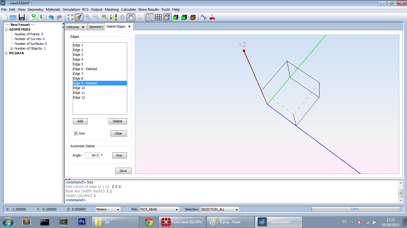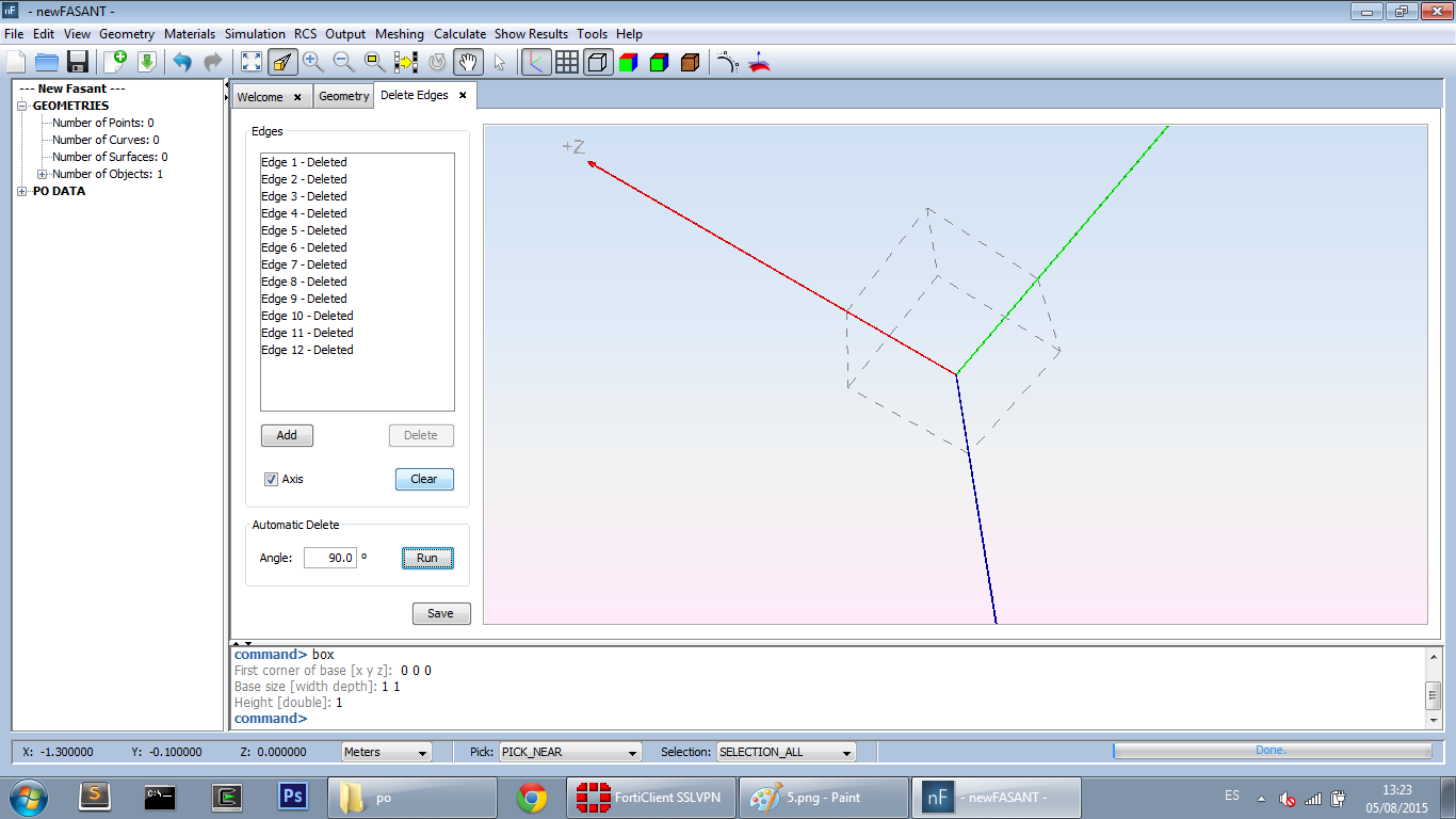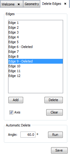 Automatic Define the angle of the edge to delete and left click on run. All of the edges with an angle smaller than the specified threshold angle are selected and shown in the window. For example, in the previously created box object, the edges represented in the next Figure are detected when an angle of 90° is defined in the Automatic Edges Deletion window.