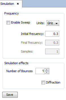 Parameters are defined by the user for the simulation on the right-side of the window where the user can select the parameters to be defined. The user may enable a single frequency simulation, or enable a swept simulation by left-clicking the Enable Sweep box. The user may then define the Initial Frequency, Final Frequency, and the number of frequency points (Samples) for the simulation.