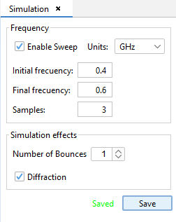 Select Simulation → Parameters. Select 1 bounce (simple reflection), and define the diffraction and a frequency sweep from 0.4E9 Hz to 0.6E9 Hz (400 MHz to 600 MHz) as shown in the next Figure, and left-click on Save button.