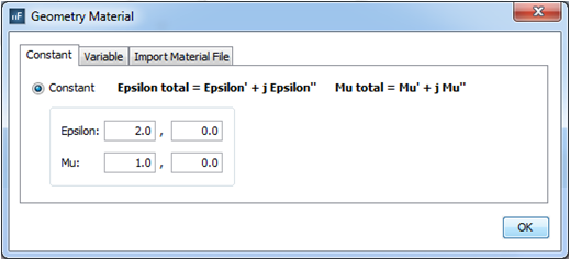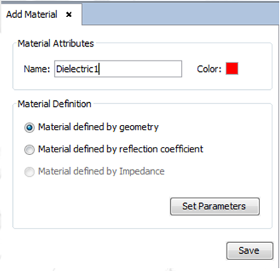 Then select the “Material defined by Geometry” option and also left-click the “Set Parameters” button to define the material properties as shown in the next Figure. Press Save.