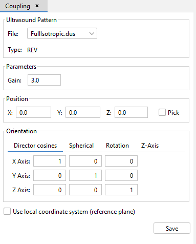 This panel allows the configuration of the new ultrasound receiver or the edition of the parameters of an already existing one. The File dropdown list allows the selection of one of the DUS file imported into the project. The Gain allows to set up the gain of the receiver (note that Gain is in natural units). The Position and Orientation panels allows to set the location and orientation of the receiver in the same way as in the Ultrasound Source panel.