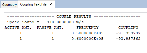 This option shows the coupling results as a text file. First, a panel will appear after selecting this option. In this panel, the user needs to select the parametric step and the speed of sound they want to show the results for. A table will be presented with the coupling values. To save the results click on the Save as... button below the text file.