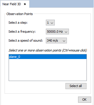 In this panel, the user needs to select the step, frequency and speed of sound they want to visualize the 3D diagram for, as well as the group or groups of observation points they want to compute the near field for. After the user has configured the parameters and pressed the "OK" button, the following panel appears: