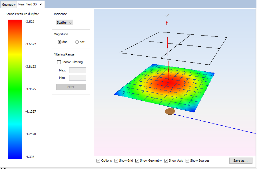 Additionally, there are several options the user can use to alter the visualization of the results, such as possibility of hiding/showing the left panel, the observation points grid, the geometry, the axes or the sources. The user can also save the 3D diagram to an image file in a given location in their computer.