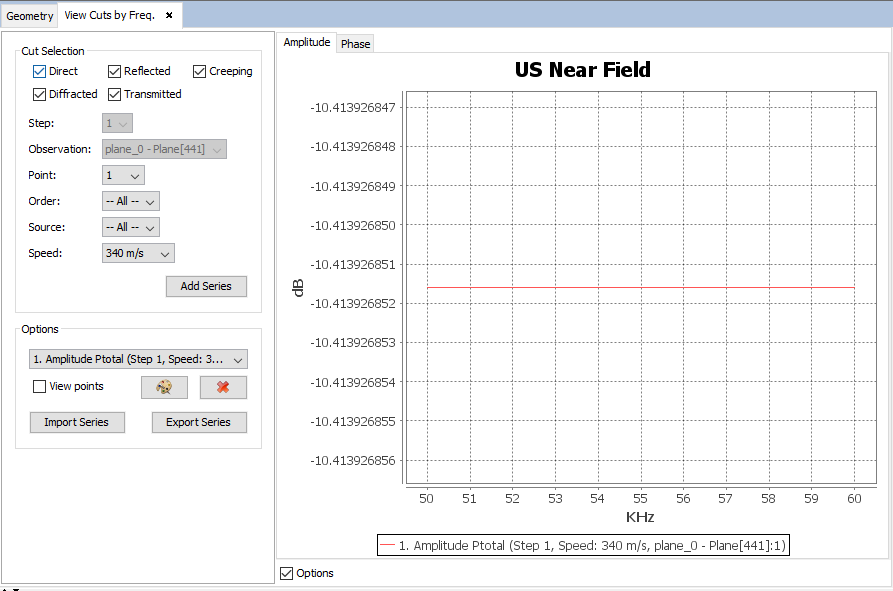 In this panel, the user can select the effects of the rays used to calculate the field, the parametric step, the set of observation points, the point, the order of the considered rays, the source and the speed of sound. By pressing the "Add Series" button, a new plot will be added to the panel.