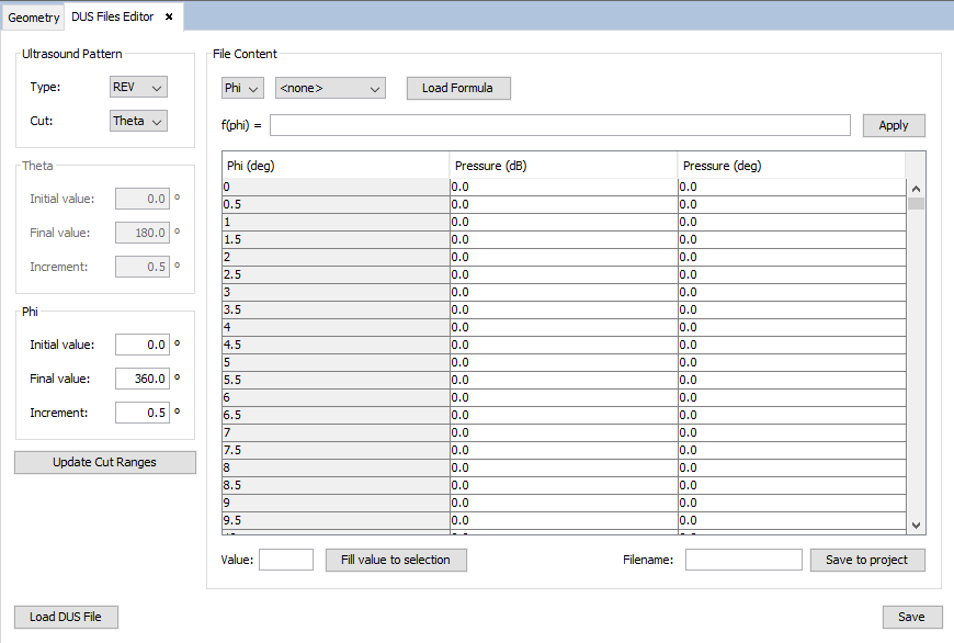 The "DUS File Editor" under the "Source" menu allows the user to create their own DUS (ultrasound pattern) files. In addition, it is possible to edit already existing DUS files. When the user selects this option, the following panel is shown: