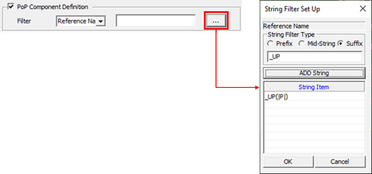 • PoP Component Definition: For parts with high component densities, such as mobile phones and digital cameras, a package on package (PoP) design is sometimes applied. Option to check if the position of pin 1 of the upper part of the PoP is the same as the position of pin 1 of the lower part. The Filter is set through the string filter to recognize the top part of the POP from the mount data.