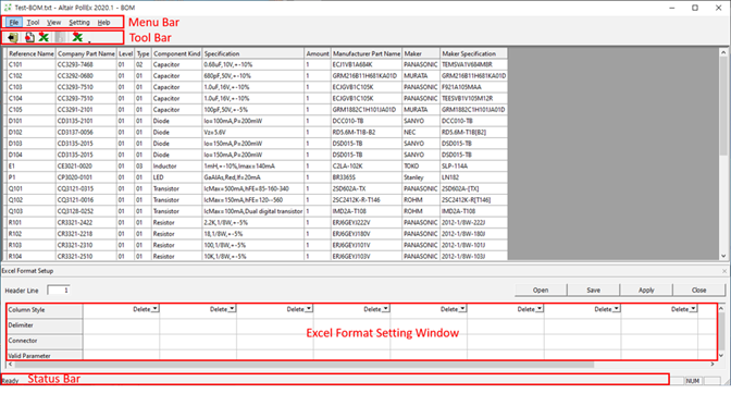 PollEx BOM window consists of the menu bar, tool bar, working area, Excel format setting window, and status bar.Figure 1. The interfaced excel is displayed in the working area.