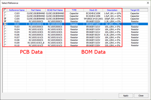 - In case of this option is checked, if the reference name is matched with PCB Data and BOM, it will be listed. In case of this option is un-checked, if the reference name and ECAD part name are matched with PCB Data and BOM, it will be listed.