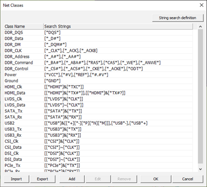 Two operators are used in the search string: # and *. *: Any string #: One Number. This net class definition will be used at Properties-Nets menu to assign net class to each net. By using net class assigned to each net, DDR nets are automatically grouped when performing Automatic DDR Bus Analysis.