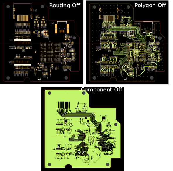 To see components, routing pattern, and copper pour more efficiently, use these menus.