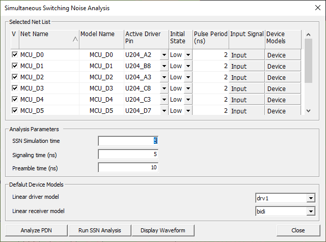 Use the Transient SSN Analysis menu to analyze interconnect network of bused nets with PDN effect of their power net in time domains to obtain the transient waveforms when they switch simultaneously.