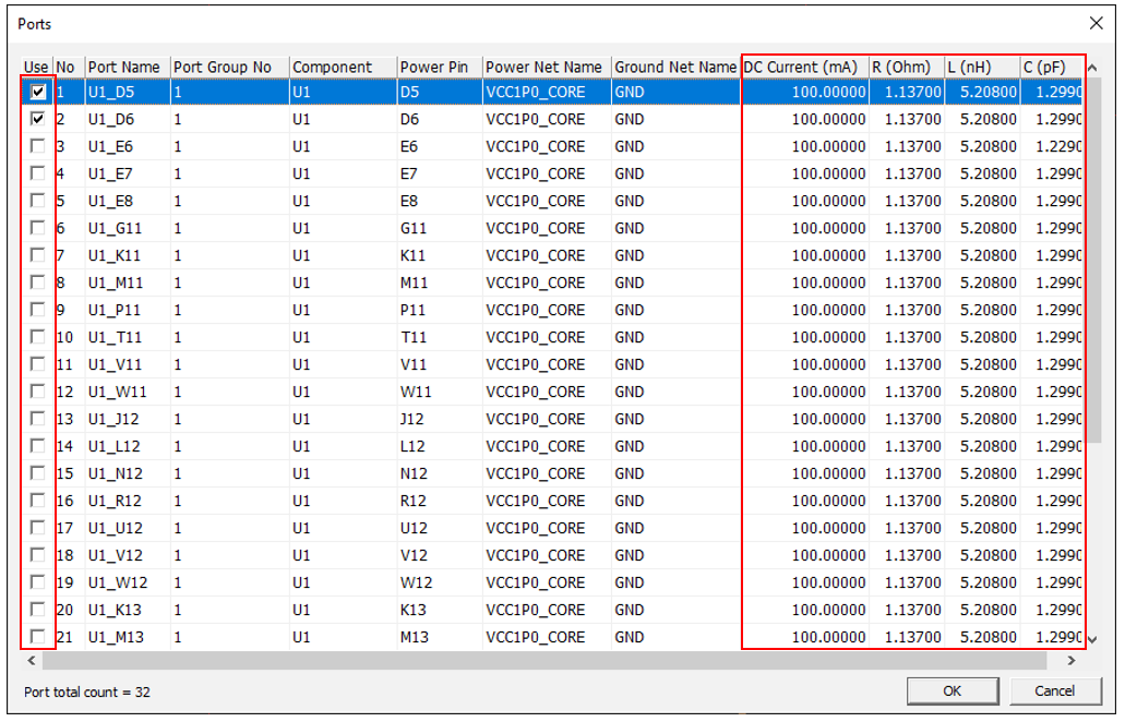 - edit the R (ohm), L(nH) and C(pF) value for each ports