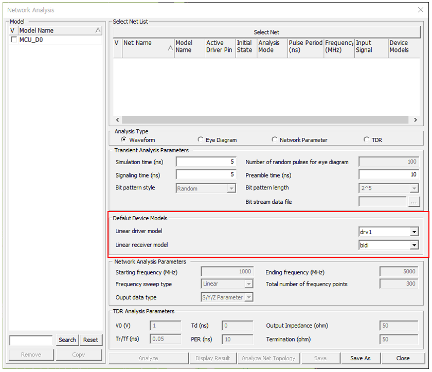 IO buffer device models of input and output pins of signal nets are stored in the part data file of individual components. When the device models are not available in the part data, the default device models defined here are used for transient simulation of signal integrity analyses. With the use of Linear Device Modeler, users can create linear output (driver) and input (receiver) device models and store them in a linear device model file. PollEx SI provides you with a system default linear device model file, UDVS.dmf.