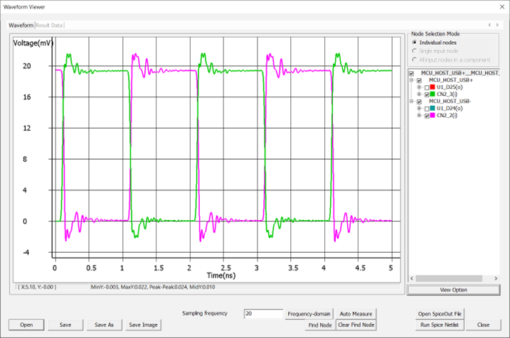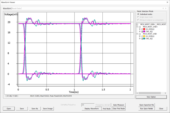 Waveform analysis is running transient circuit simulation on the network model for user-specified simulation time to obtain time-domain voltage waveforms at the input and output nodes. Upon completion of the analysis, waveforms at all input and output nodes are displayed. If you select or deselect an input node for waveform display, the corresponding differential pair nodes are automatically selected or deselected. Many displays and measuring options are available in the waveform viewer.