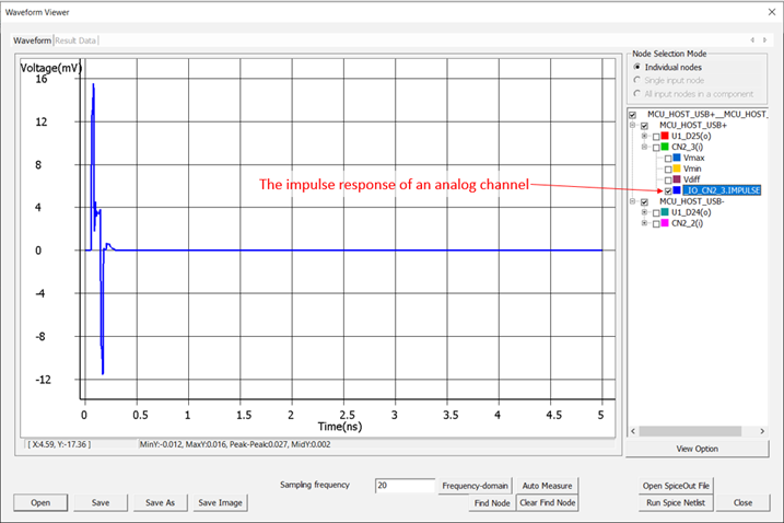 By selecting the submenu of the receiver (CN2_3) as shown below, you can view the calculated impulse response of the analog channel (such as buffer parasitics, PCB, connector, or cable). If connectors and cables are provided as S-parameter models, the simulation is possible. The following represents the impulse response regarding the positive net of a differential line.