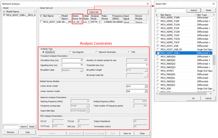 Multiple nets can be selected for analysis, but each net is modeled separately without coupling it to other nets. If one of the differential nets is selected, the corresponding differential pair net is automatically selected, and if multiple differential pair nets are chosen as the model, the simulation proceeds sequentially, one by one.