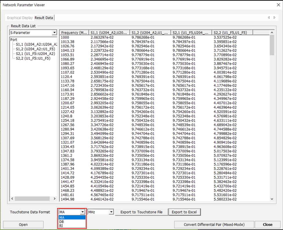 Touchstone Data Format are extracted to MA(magnitude), DB(decibel), and