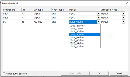 9. Device Models: The Device Model List dialog will be open. You can review default device models selected for the output and inputs pins. For the selected active driver, actual driver model can be selectable among many different models in IBIS or Linear device model types. You can use one of available models considering the output impedance, driving capability measured by output current level and operating frequencies.
