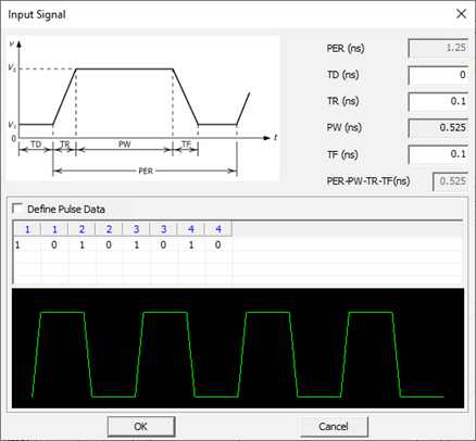 8. Input Signal: The Input Signal dialog opens. You can review and change the detailed parameters which can specify the actual shape of the input signal, for example: TD (Time Delay), TR (Rise Time), TR (Fall Time), PW (Pulse Width), and pulse train.