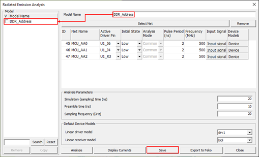 1. Save: Any simulated nets can be saved and selected again when the PCB reactivated later by clicking Copy. The saved models are listed in the left-hand side of the dialog. You can select the saved models anytime and copy the model to view the model, view the analysis results, edit the model, and rerun analysis.