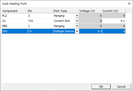 - In the Joule Heating Ports dialog, change the Port Type of each component to Voltage Source and Current Sink, respectively depending on the function.