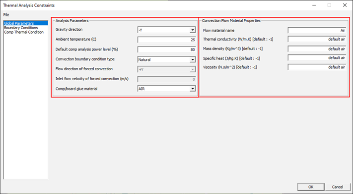 Thermal Analysis Constraints is used for defining thermal analysis constraints, such as global and local thermal boundary conditions and local component thermal properties.