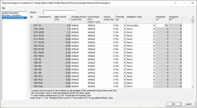 Globally defined thermal analysis control parameters and global boundary conditions are applied to all components on the board. Using the Local Boundary Condition tab in the Analysis > Thermal Analysis > Thermal Analysis Constraints menu, you can override the globally applied conditions for individual components by defining local conditions to the components.