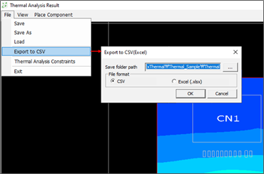 The PollEx Thermal results can be saved in .PTHR format by clicking Save or Save As. Also, detailed results such as temperature for each location of the result can be exported in CSV or EXCEL format.