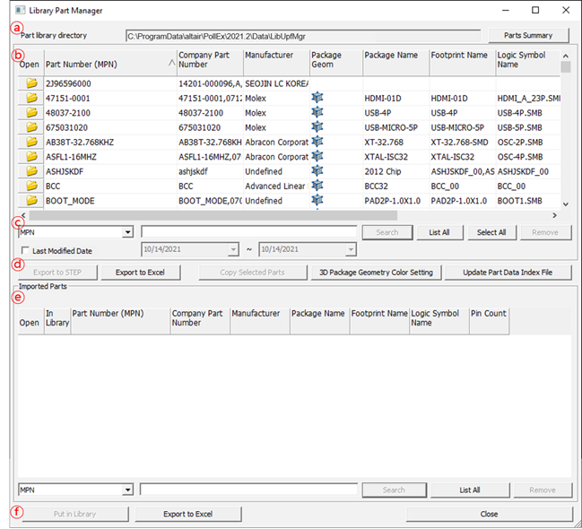 5. Imported Parts: Display the list of imported parts from a ECAD system.