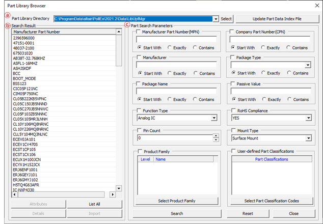 - Part Search Parameters: Define the keyword parameters for searching the part.